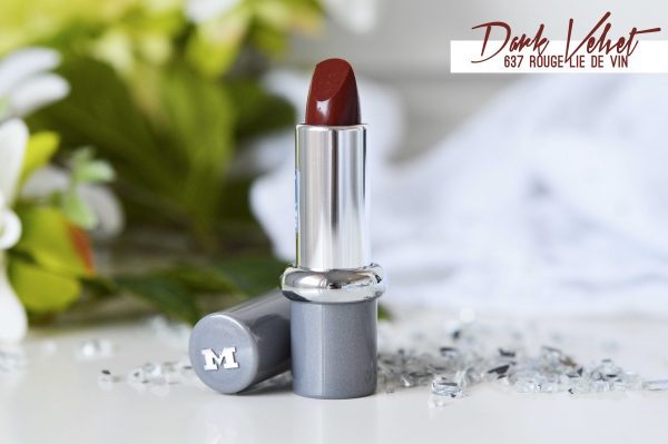 On commence avec le plus sombre de la bande, le numéro 637 aka Dark Velvet ! Attention à son petit nom un peu trompeur : pas de fini mat ou velvet au programme, mais bien un rendu crémeux et bien brillant. Cette couleur c’est un peu le must-have de l’hiver : un joli rouge lie de vin très intense et parfait pour apporter un peu de caractère à n’importe quel maquillage. Même s’il est franchement bien pigmenté, tu peux tout à fait le porter de manière un peu moins intense, puisque sa base reste assez modulable. Cette teinte est une vraie pépite, et fait sans aucun doutes partie de mes favorites.