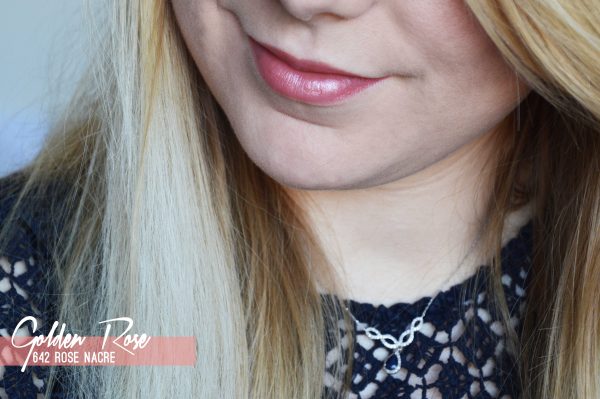 Et on termine avec le sixième et dernier tube de la bande, le fameux Rose Golden (numéro 642) au fini nacré. Honnêtement je n’étais pas tellement emballée par sa couleur de prime abord. Il me faisait énormément pensé aux rouge à lèvres que portait Mamy B à l’époque de ma tendre enfance (si lointaine…), et avec lesquels je m’amusais à dessiner (le sacrilège ultime XD). Un fini nacré, légèrement marroné…Pas forcément ce à quoi j’adhère en temps normal. Et finalement absolument pas. Il s’agit d’un joli nude, tout en transparence, avec un effet nacré dans les tons dorés, très discret. Il réhausse joliment la couleur des lèvres, et accroche vraiment bien lumière…