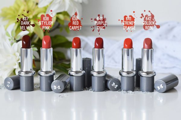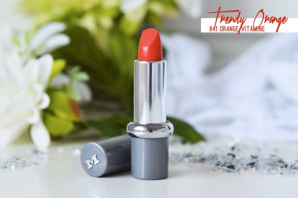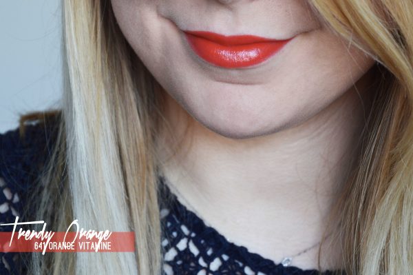La cinquième teinte de la collection, n’est autre que Trendy Orange, le numéro 641 qui comme son nom le laisse deviner : est le orange de la bande ! Un rouge orangé chaud, et pétillant à souhait sur lequel je n’aurais franchement pas misé au départ…Et qui finalement me plait beaucoup ! Il se rapproche pas mal de Red Carpet, même si il est un poil plus vitaminé une fois sur les lèvres. Je trouve la teinte parfaite pour la fin d’été, et pour l’automne, bien que d’habitude je ne porte absolument pas ce genre de couleurs.Là encore la formule est ultra riche en pigments et couvrante en quelques passages.