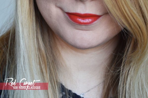 Of course, cette collection Boutique n’aurait pas été complète si elle n’avait pas compté parmis ses tubes un vrai rouge : the Rouge Carpet, le numéro 639 ! Sans surprises, il s’agit d’un très beau rouge coquelicot au rendu bien brillant. Comme le Dark Velvet, il s’agit d’une texture crème ultra riche en pigments, qui donne un résultat bien opaque en quelques passages à peine. La couleur est intense, lumineuse et parfaite pour la saison : mais en même temps, a-t’on une saison pour le rouge à lèvres rouge? Personnellement j’en porte très régulièrement…