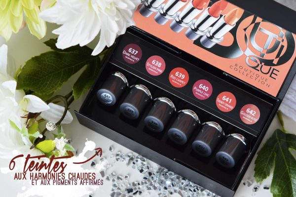 Par contre, ce que je ne savais pas, c’est que comme pour les vernis, la marque propose régulièrement de nouvelles collections, avec des teintes inédites ! Et pour le coup, j’ai eu la chance de pouvoir découvrir la toute dernière en date : La Collection Boutique de la saison Automne/Hiver 2017. Un programme haut-en-couleurs !