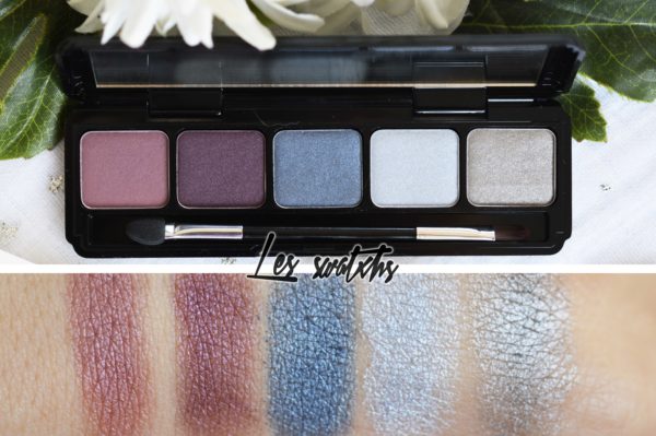 La pièce maitresse du kit, c’est bien entendu la Palette Double Expression, qui va nous permettre de composer nos petits looks au fil du temps. Il s’agit de la version n°2 nommée Profondeurs. Elle contient 5 fards dans les tons prunes, bleus et gris. Pas de fini mat au programme, tous les fards sont légèrement irisés.
