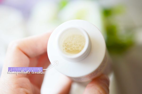 Elle se présente dans un petit flacon en plastique opaque de 100ml, c’est pas énorme mais bien pratique. Coté composition on trouve à l’intérieur : de l’extrait de lavande bio (apaise, soulage et favorise la cicatrisation)du jus d’aloe vera (hydrate), et enfin de l’eau de bleuet bio (décongestionne, apaise, et aide à prévenir les rougeurs). Son parfum est très doux, on sent peu la lavande, et le bleuet est quant à lui assez discret donc pas désagréable. Je me suis empressée de tester la bête avec les petits cotons fournis et franchement, je suis ravie ! Cette lotion est parfaite pour démaquiller les makeup légers de tous les jours. Peut être un peu moins efficace sur le mascara, mais franchement au quotidien c’est suffisant.