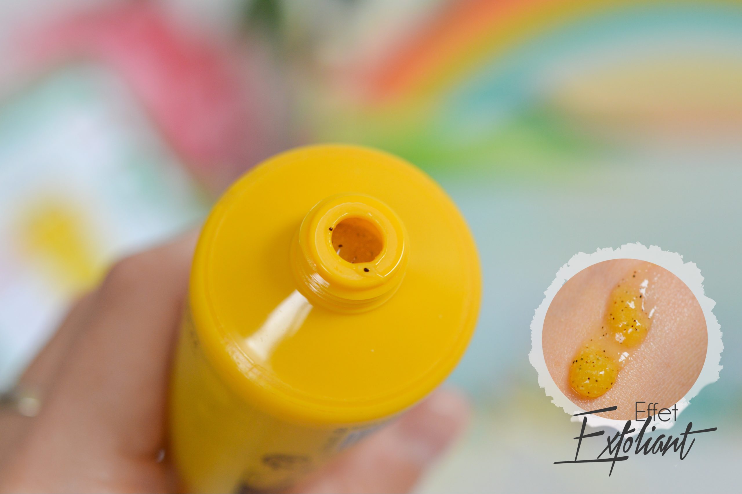 Ce soin se présente dans un flacon souple de 100ml. A l’intérieur on retrouve un complexe bio-actif de banane jaune (réparateur et régénérant), ainsi que de la poudre de noix de coco (pour un gommage en douceur). Gros coup de cœur pour le parfum estival de ce produit, ça donne l’impression d’être en vacances !