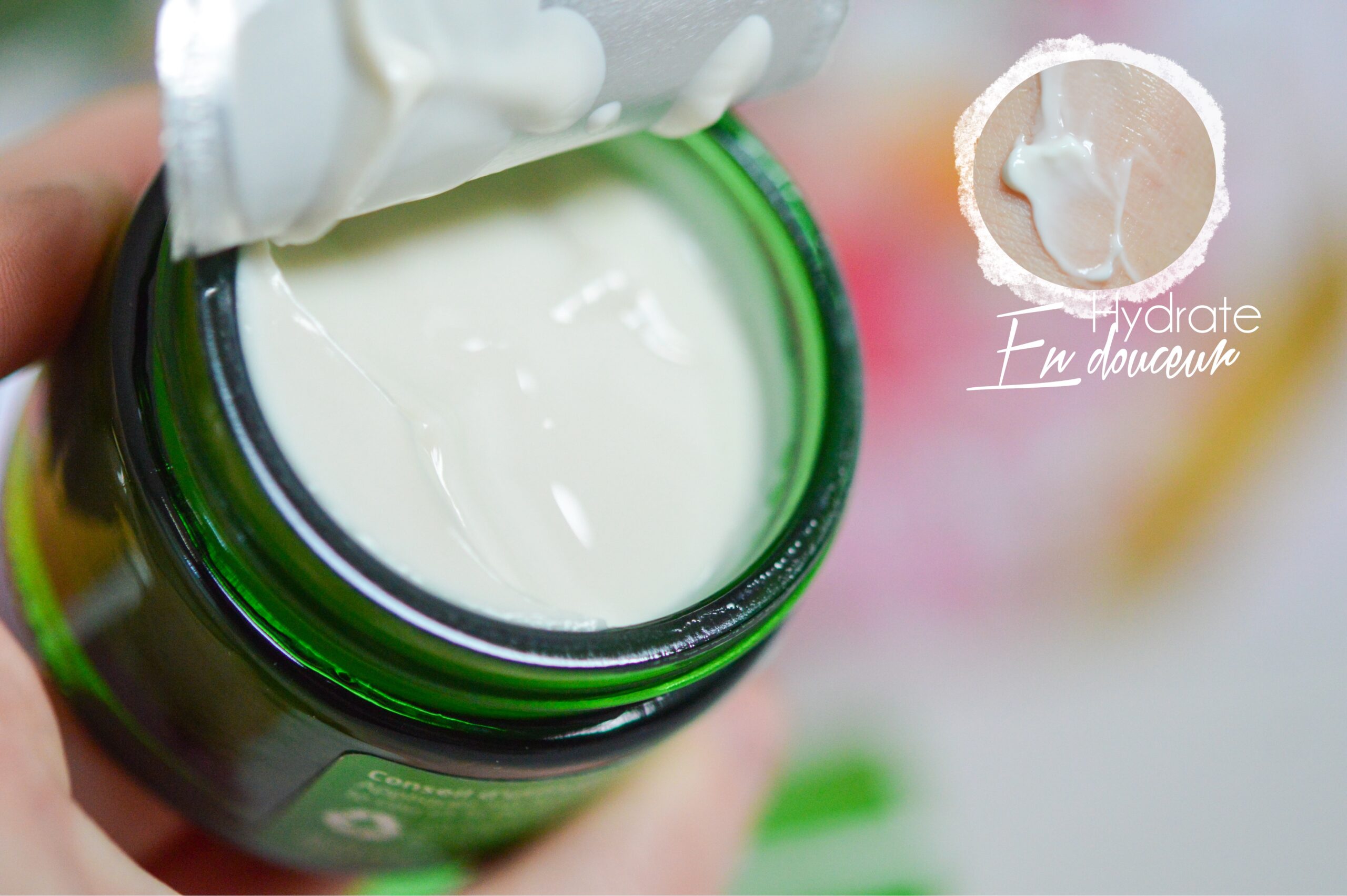 Elle se présente dans un petit pot en verre de 40 ml. Pour ce qui est de sa composition, on trouve à l’intérieur de l’huile de karité (hydrate, adoucit, prévient du vieillissement, cutané), ainsi que de l’huile de tournesol (hydrate et repulpe la peau). Sa texture crémeuse est ultra réconfortante, et elle possède un parfum légèrement acidulé vraiment agréable à l’application. Pas d’effet peau grasse, elle laisse le visage bien hydraté et la peau rebondie.
