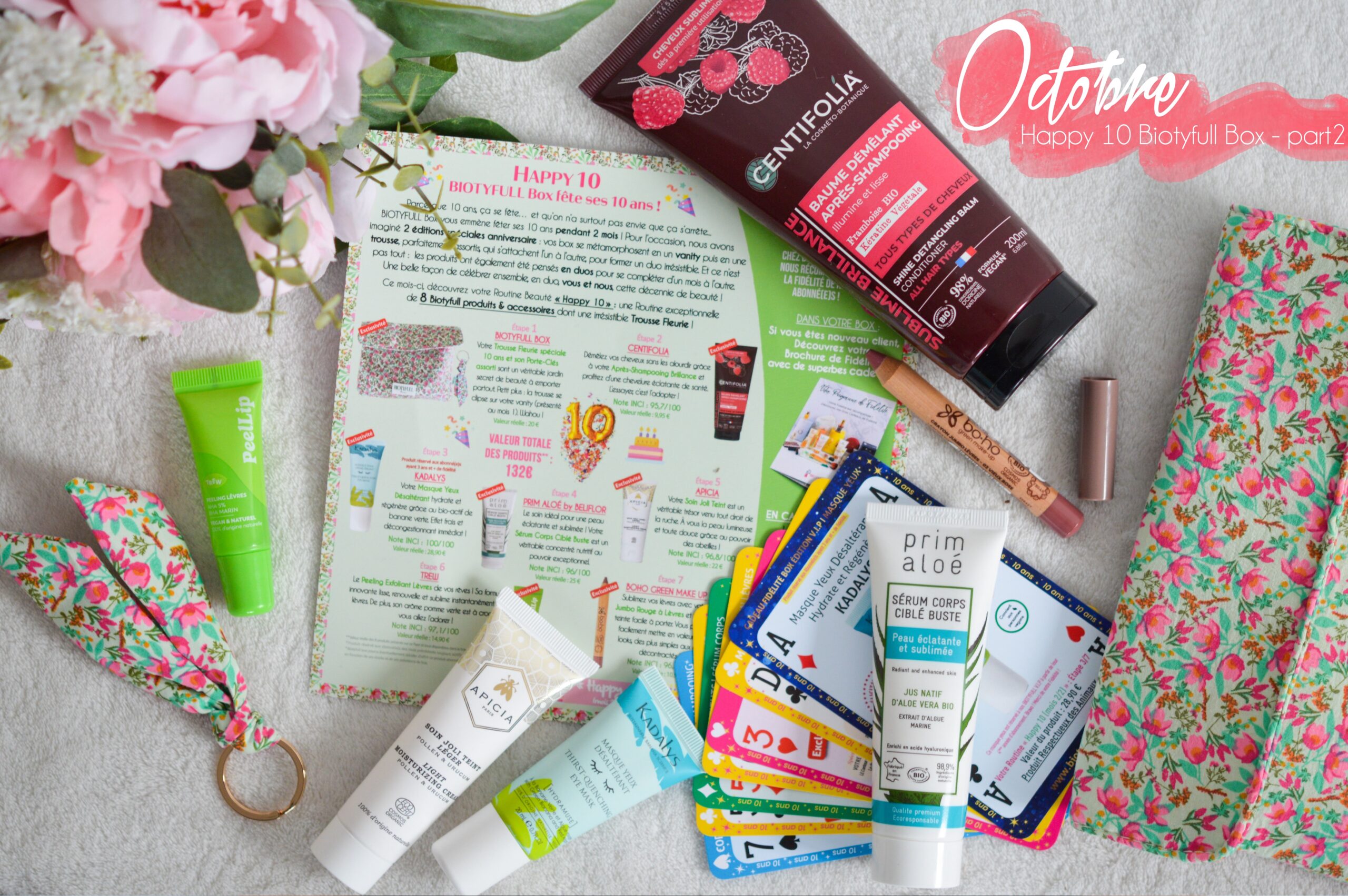 On démarre avec la très attendu deuxième partie de notre Vanity fleuri du mois dernier : j’ai nommé la trousse assortie de notre ensemble Biotyfull Box spécial 10ans ! Puisque comme je vous l’expliquais le mois dernier, cette édition spéciale a été pensée en duo. Et comme la Team ne s’arrête jamais, elle nous a glissé avec ça, un petit porte-clef assorti. De quoi terminer de célébrer cette 10ème bougie comme il se doit .