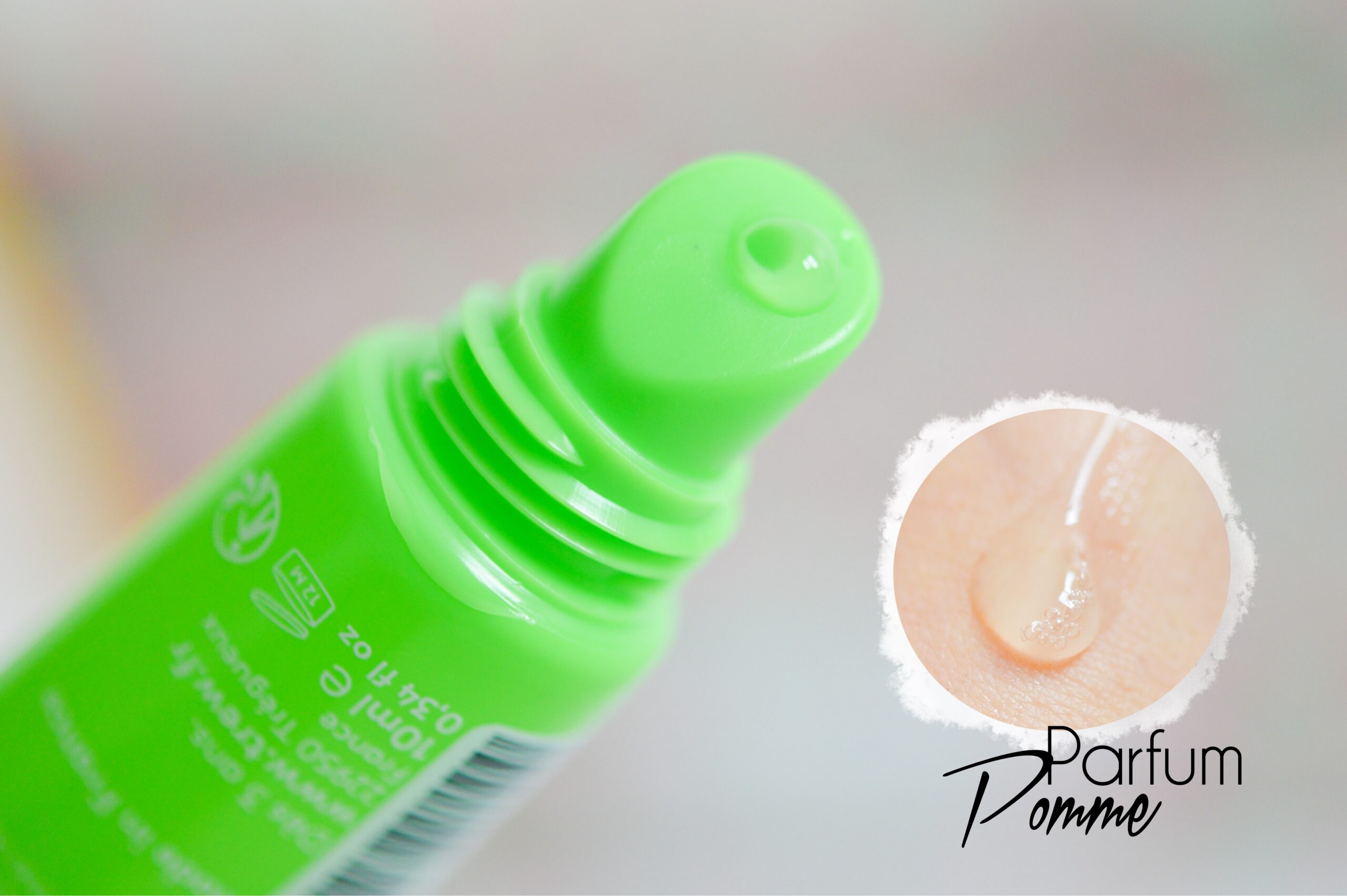 Ce soin se présente dans un petit tube souple de 20ml, et possède un embout applicateur précis. On l’applique sur le contour des yeux, on laisse poser 10 à 15min puis on retire l’excédentaire avec un coton. Ensuite, on peut tapoter du bout des doits pour stimuler la circulation. A l’intérieur on trouve un complexe d’algues rouges (aide à renforcer la barrière protectrice de la peau), ainsi que le bio-actif de banane verte (maintient l’élasticité de la peau, sa souplesse et son hydratation).