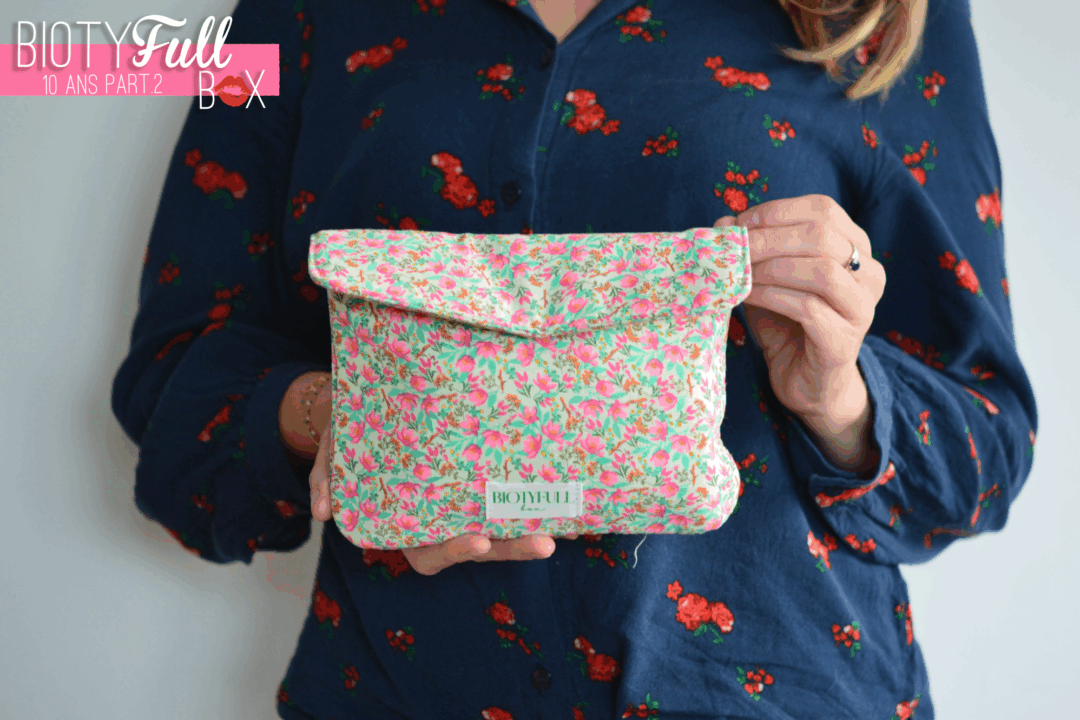 On démarre avec la très attendu deuxième partie de notre Vanity fleuri du mois dernier : j’ai nommé la trousse assortie de notre ensemble Biotyfull Box spécial 10ans ! Puisque comme je vous l’expliquais le mois dernier, cette édition spéciale a été pensée en duo. Et comme la Team ne s’arrête jamais, elle nous a glissé avec ça, un petit porte-clef assorti. De quoi terminer de célébrer cette 10ème bougie comme il se doit .