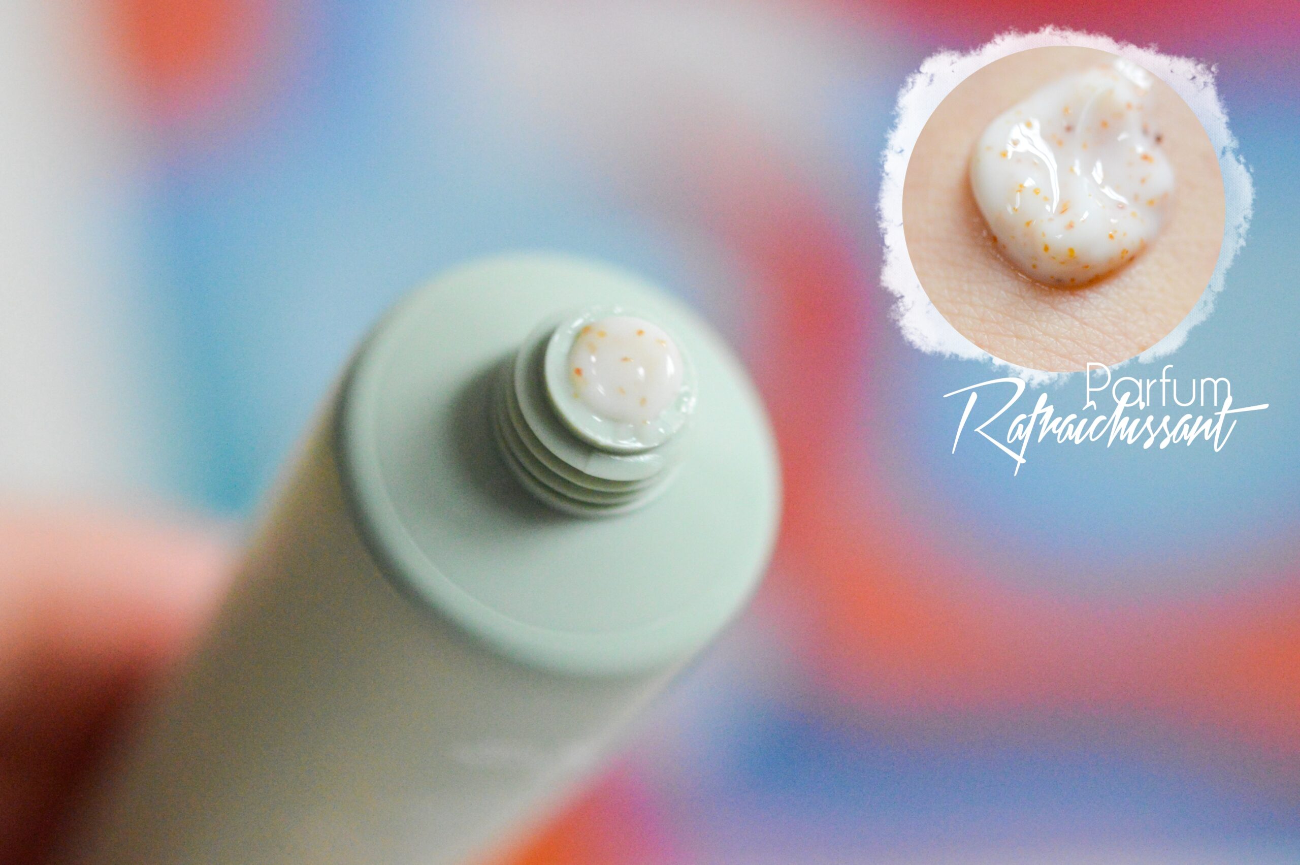 Ce soin se présente dans un petit tube de 30ml (et sent divinement bon). Côté composition on trouve de la poudre de noix finement broyée pour exfolier. Mais aussi de la Centella asiatica, du thé vert et du beurre de karité (apaisants, hydratants et nourrissants). La formule crémeuse à souhait, sent divinement bon. C’est très frais sur la peau et on peut gommer la peau en douceur. Les grains sont très fins et peu abrasifs.
